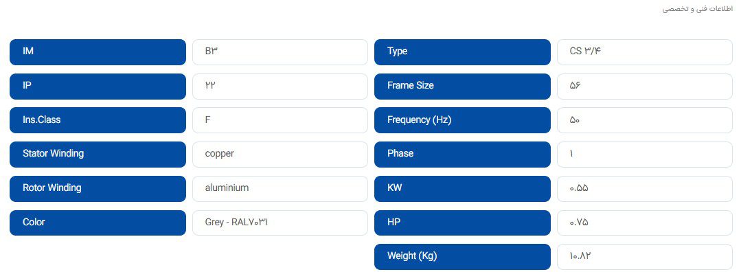 مشخصات الکترو موتور 3/4 اسب موتوژن به شرح زیر است: