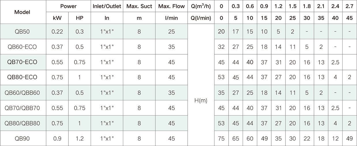 پمپهای سری QB از نوع پمپهای توربینی محیطی هستند که برای ایجاد فشار بالا با نرخ جریان محدود طراحی شدهاند. پروانه پمپ آب نیم اسب محیطی QB60E تایفو TAIFU از برنج و بدنه پمپ از چدن ساخته شده است. این پمپها فقط برای آب تمیز مناسب بوده و عمدتاً برای تقویت فشار آب در سیستمهای تقویتکننده کوچک و سیستمهای شستوشو مورد استفاده قرار میگیرند. درجه حفاظت آن IP44 است.