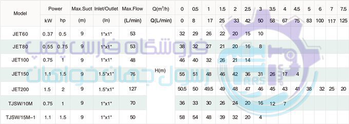 مشخصات فنی پمپ آب یک اسب جتی JET100 تایفو TAIFU: